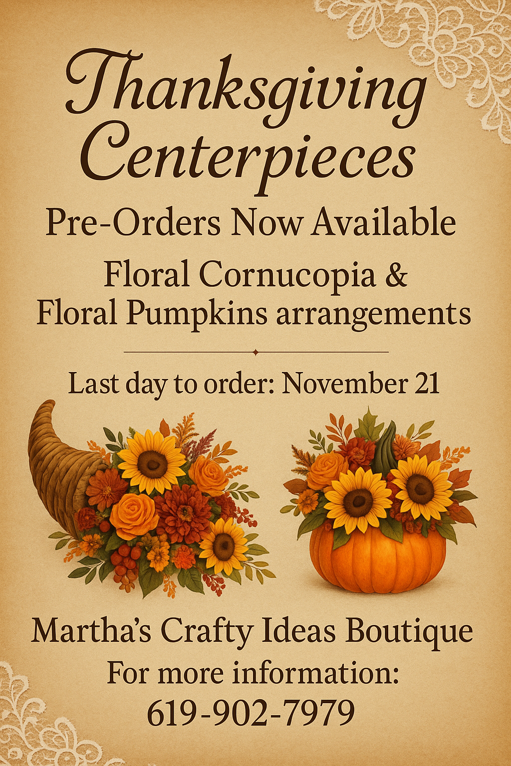 Celebrate the season with our handmade floral cornucopias and pumpkin centerpieces. Each one is uniquely crafted! Stop by to reserve yours. PLEASE NOTE: A limited selection of arrangements will also be available in-store on Nov 25 & 26, while supplies last. Call for any info 619-902-7979